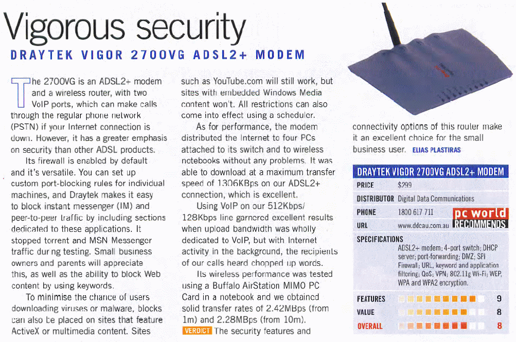 Vigor 2700VG 获得九月份澳大利亚PC USER杂志 “TOP BUY”