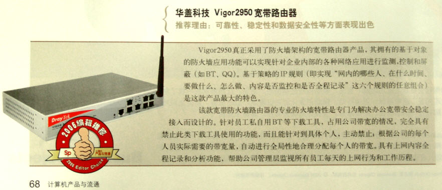 Vigor 2950 获得 2006 年度《计算机产品与流通》杂志“编辑选择奖”
