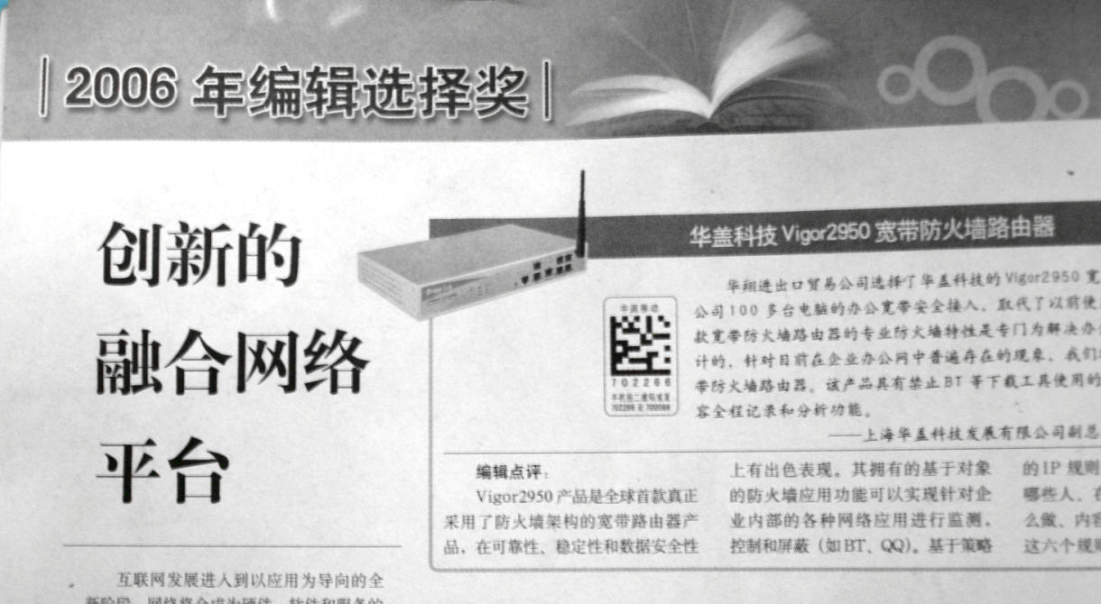 Vigor 2950在2006年末的《中国计算机报》年度产品评选中荣获“编辑选择奖”