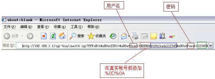 由于特殊字符ASCII码rn,无法用键盘输入实现,因此不能通过手动修改用户帐号进行路由器拨号连接。经过分析,实现rn特殊字符的输入只需在真实用户帐号前添加%0D%0A即可。根据这种情况,我们修改了路由器管理页面的登录地址加以解决。