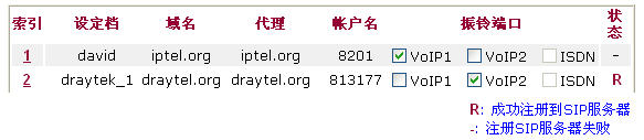 然后您可以通过路由器设置页面->>VoIP设定->>VoIP呼叫状态栏,查看SIP帐号是否已被注册。(R)表示成功注册到SIP服务器;( - )注册SIP服务器失败。