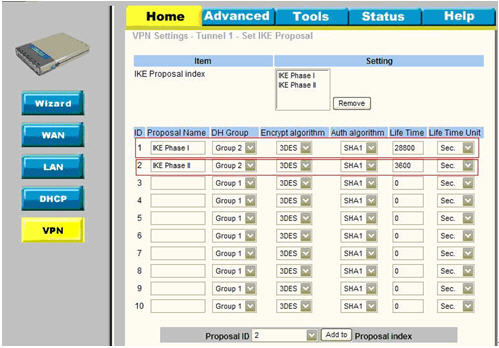 4. 选择“Select IKE Proposal”进行IKE设置。设定2个IKE密钥有效协商时间。