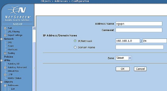 一、 Vigor的配置: (一) Vigor作为VPN Client: 1.基本设置(Common Settings): a. 输入Profile Name. b. 选择 "Enable this Profile". c. 选择 Dial-Out,Idle Timeout 选项设为0,这样可以始终维持IPSec隧道的开通直到远端拨入端发出终止命令。如果选择Always on, 那只要连接一中断路由器就会自动重拨。 2. 拨出设置(Dial-Out Settings): a. 选择IPSec 模式。 b. 输入远端VPN server的IP地址/主机名字。 c. 输入IKE Pre-shared 值。 d. 选择一个IPSec 安全模式: 中等(AH)或高(ESP)。 e. 选择Advance, 选择 “Aggressive mode” ,输入Call ID(你可以输入IP地址,Email或者表示对方ID的字符串)。 4. TCP/IP网络设置(TCP/IP Network Settings): 输入远端局域网内网IP地址及其网关。 (二) Vigor作为VPN Server: 1.基本设置(Common Settings): a. 输入Profile Name. b. 选择 "Enable this Profile". c. 选择 Dial-In,Idle Timeout 选项设为0,这样可以始终维持IPSec隧道的开通直到远端拨入端发出终止命令。 3. 拨入设置(Dial-in Settings): a. 选择IPSec 模式。 b. 选中 “Specify Remote VPN Gateway”。 c. 输入对方ID(你可以输入IP地址,Email或者表示对方ID的字符串) d. 输入IKE Pre-shared 值。 e. 选择一个IPSec 安全模式: 中等(AH)或高(ESP)。 4. TCP/IP网络设置(TCP/IP Network Settings): 输入远端局域网内网IP地址及其网关。 二、 Netscreen的配置: 1. 单击" Objects " -› " Address " -› " List " ,选择 " Trust "单击 New 来添加 Netscreen's LAN address. 2.输入 Address Name,选择IP/Netmask并输入其值,单击ok. 3. 选择 " Untrust " 单击 New添加 Vigor的 LAN address. 4. 输入 Address Name,选择IP/Netmask并输入其值,单击ok. 5.单击" VPN " -› " AutoKey Advanced " ,单击 New添加 Gateway 输入 Gateway Name. 选择 Dynamic IP Address. 输入 Peer ID fae@draytek.com.cn 输入Preshared Key 然后单击 Ok. 单击 Advanced. 6.为Vigor 选择 Proposal 选择 aggressive模式. 单击 Return. 7.单击 " VPN " -› " AutoKey IKE",单击New添加 AutoIKE. 输入VPN Name. 选择在 AutoKey Advanced里的设置作为Select Remote Gateway. 单击Ok. 单击 Advanced. 8.为Vigor 选择Proposal. 单击Return. 9.单击 "Policy" Source Address 选 local LAN. Destination Address选 Vigor的 LAN. Service选ANY. Action选Select "Tunnel" of Action. 将你在AutoKey IKE(P2)中的设置作为VPN tunnel 的选项,单击ok. 10. 单击 "Policy" Source Address 选 Vigor的 LAN. Destination Address选local LAN . Service选ANY. Action选Select "Tunnel" of Action. 将你在AutoKey IKE(P2)中的设置作为VPN tunnel 的选项,单击ok.Please click "Policy" on the left menu.
