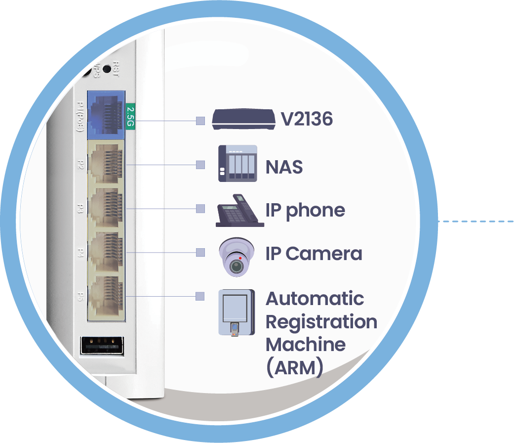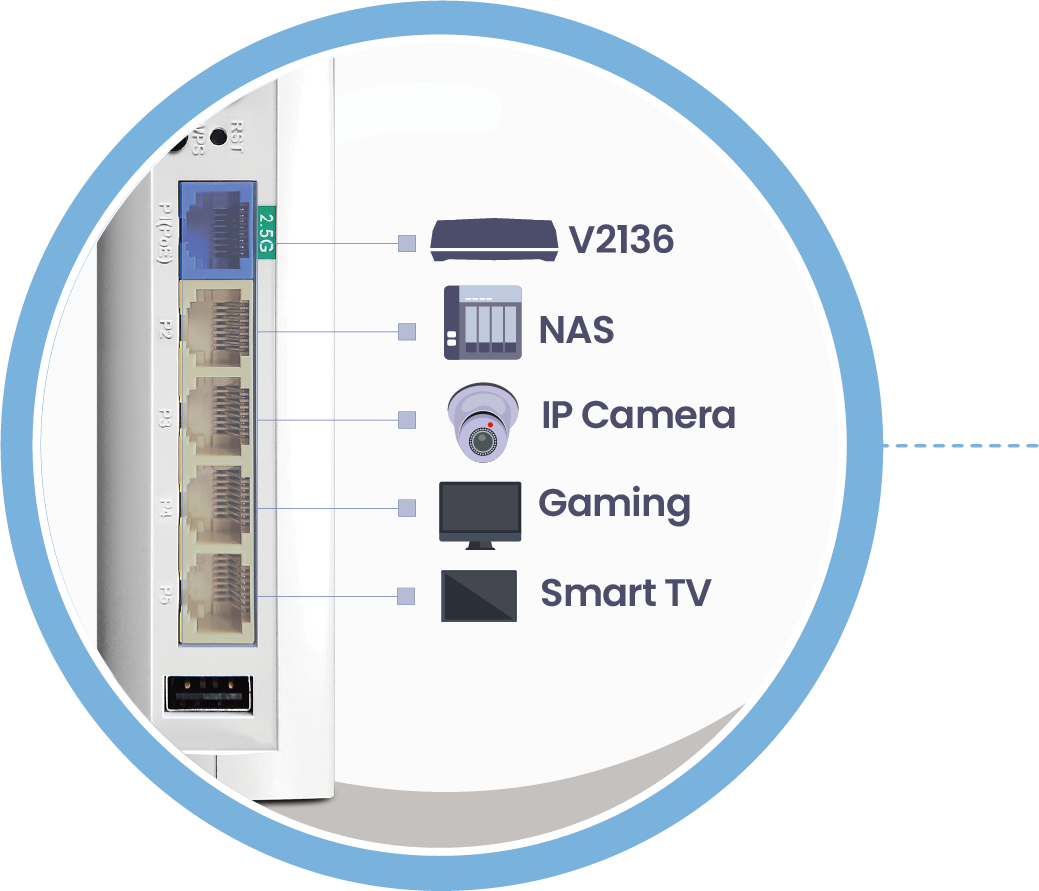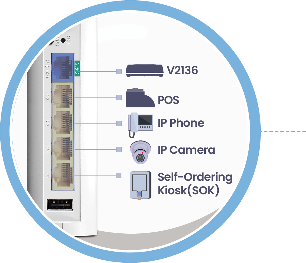 VigorAP 905 配备 1x2.5GbE 和 4x1GbE LAN 端口,提供高速和标准以太网连接的平衡组合。