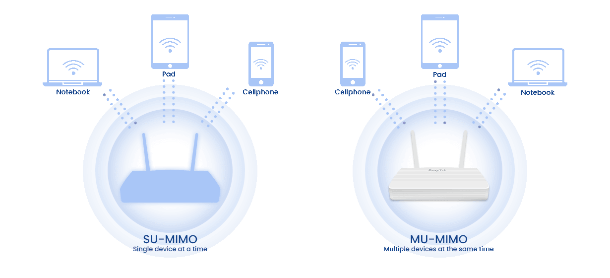 MU-MIMO 类似于多辆卡车同时为用户服务。它增加了容量并提高了每个用户的速度。