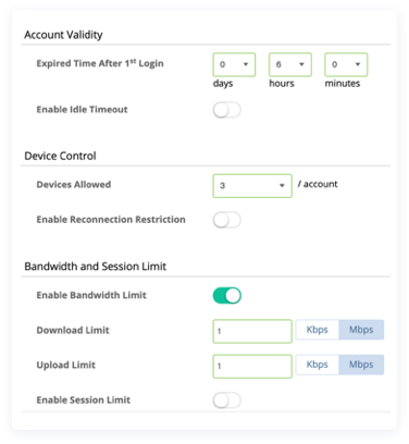 定义您的访客可以使用多少资源,包括下载/上传限制和会话限制。